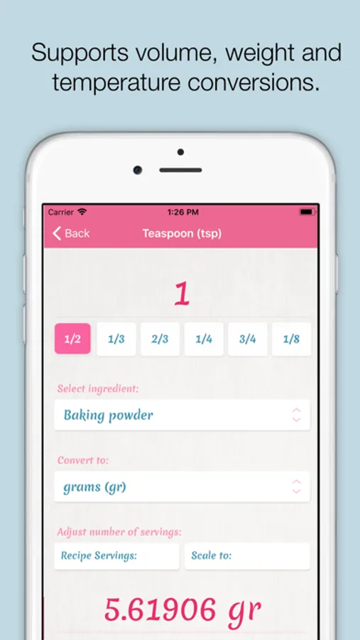 * Enter amounts and view results in standard cooking fractions (1/2, 1/3, etc )