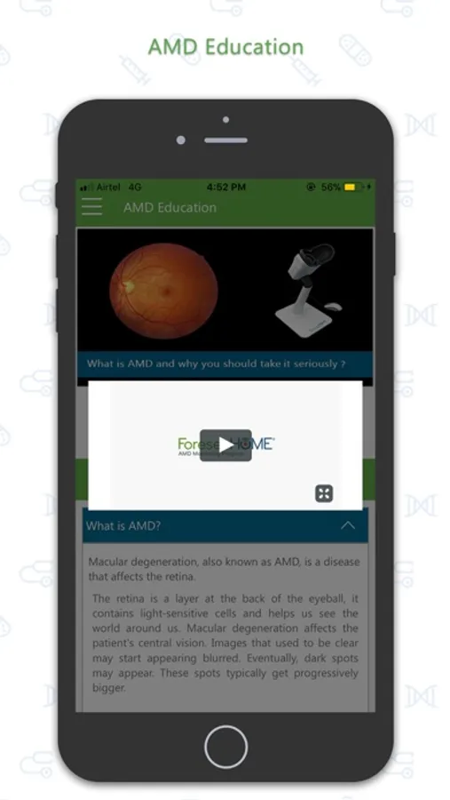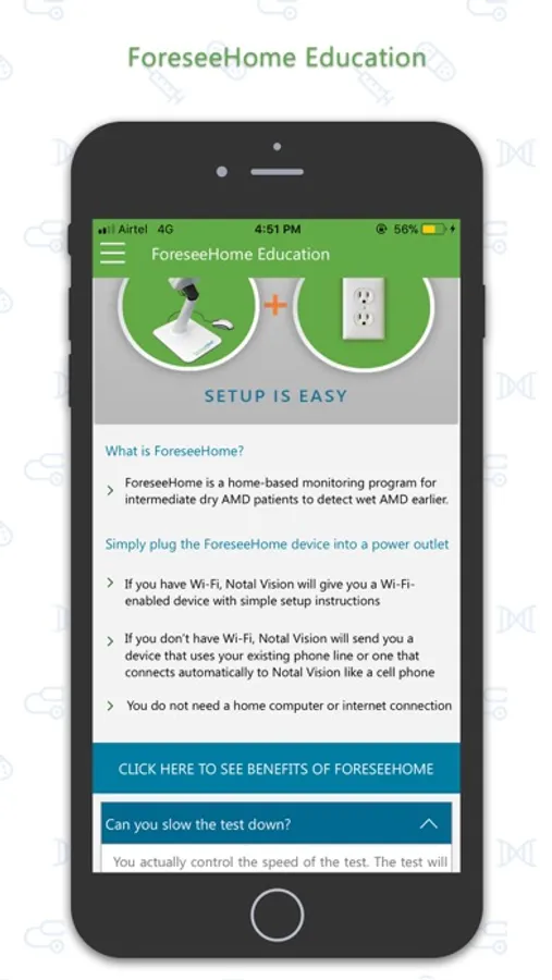ForeseeHome, a product of Notal Vision, is a home-based ophthalmology diagnostic device that can detect wet Macular Degeneration earlier to help preserve your vision. The patient app allows you to review your testing reports, learn more about macular degeneration and the ForeseeHome program, and contact us