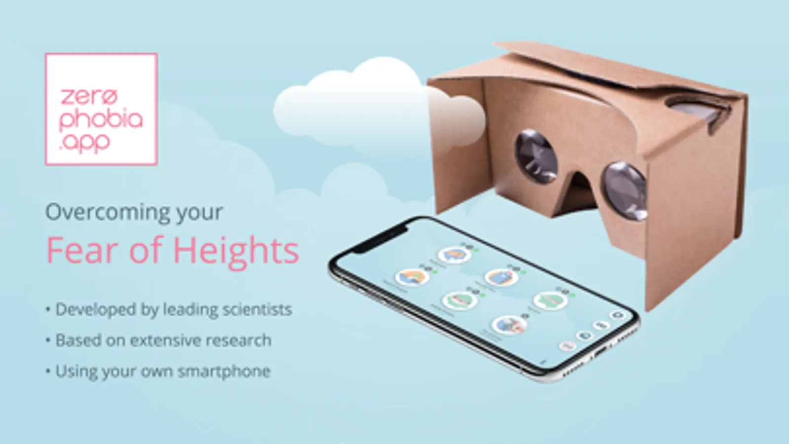ZeroPhobia helps people to conquer their fear of heights. Developed by a team of leading psychologists and therapists from VU University Amsterdam and the University of Twente, ZeroPhobia offers a complete treatment program. All you need is some time, your smartphone and a basic virtual reality viewer (e.g., Google Cardboard). Our mission is to make evidence-based treatment simple, accessible and affordable.