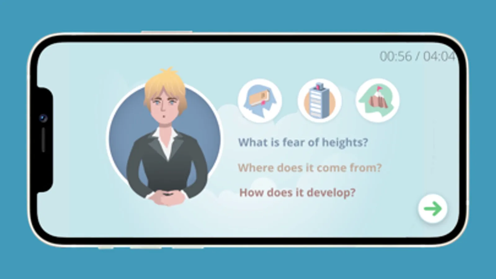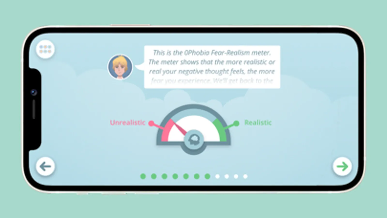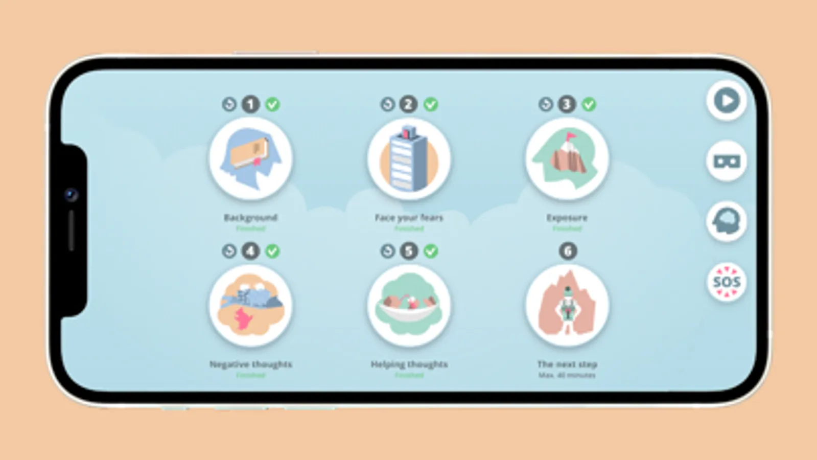 ZeroPhobia is a complete self-help program. A virtual therapist guides you through every step of the program. Six engaging modules provide you with information about the nature of your fear, how to deal with it, setting goals, getting through difficult moments, tackling negative thoughts and practicing with challenging situations. You will practice in a way that is challenging yet completely safe in a gamified virtual reality environment.