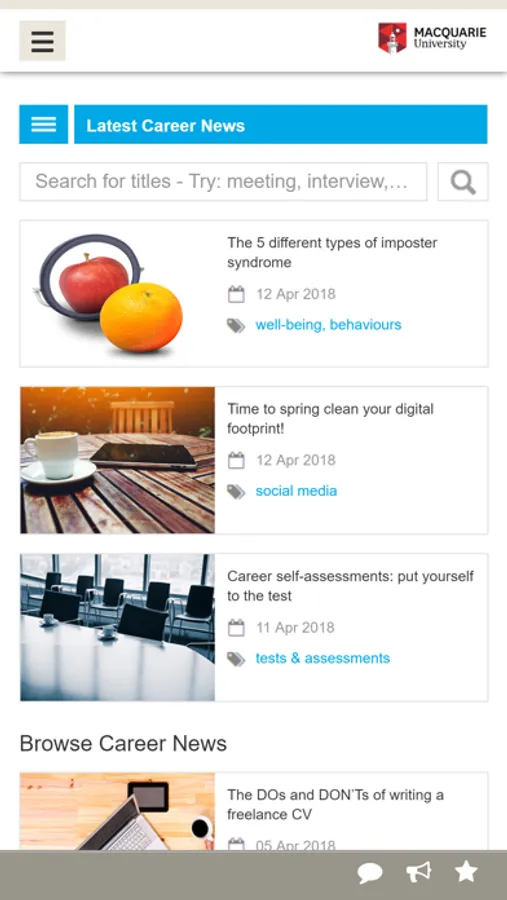 This app connects to your existing Careerhub account and allows you to improve your employability on the go. Everything you do in the app is in sync with your Career Centre account and you always have access to the latest career tools, news and resources.
