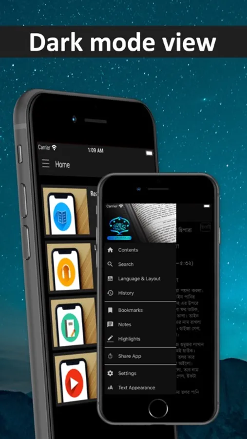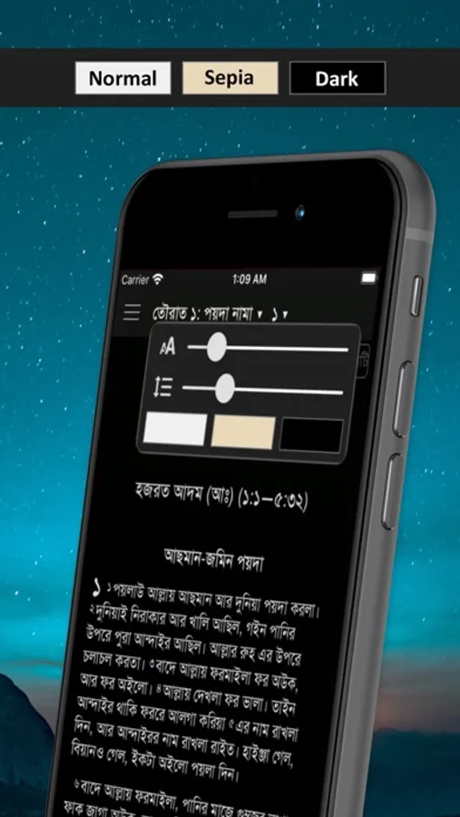 Choose preset reading layouts from the contents menu or customise for your preferences in the Language & Layout tab: single pane (one language or script), two pane (two languages or scripts), or verse by verse view (three languages or scripts). Change the size of the text and the color theme (light, dark or sepia) in the Text Appearance tab.