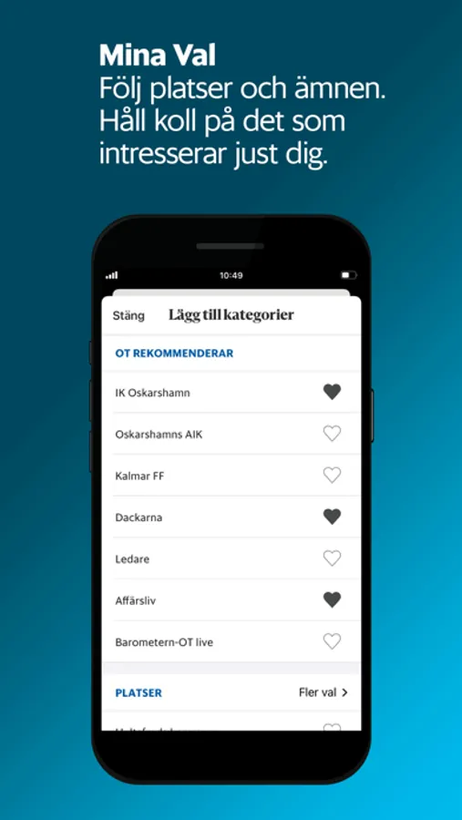 Under Mina val väljer du själv vilket innehåll du vill se i ditt nyhetsflöde. Du kan göra val utifrån geografi och intressen och väljer också om du vill ha pushnotiser så fort det publiceras nyheter i något av de ämnen du valt.