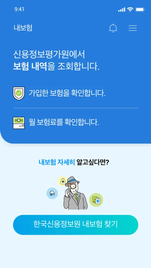 2. 한국신용정보원에서 제공하는 보험 정보를 바탕으로 가입한 보험의 과다/부족 내역, 중복가입 여부 등 자가진단서비스를 제공합니다.