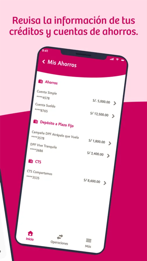 Visualizar tus cuentas (Ahorro, DF, CTS) y sus movimientos con un solo toque.