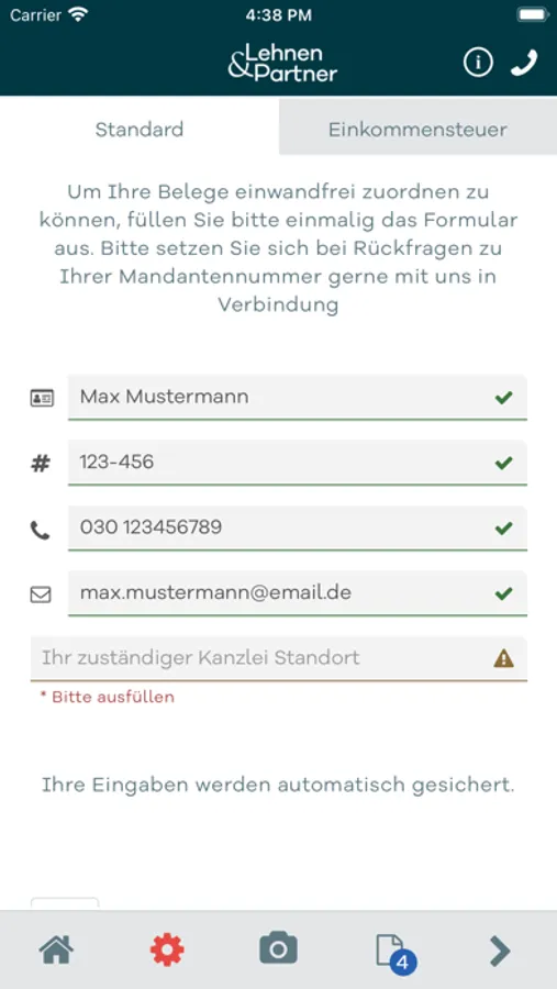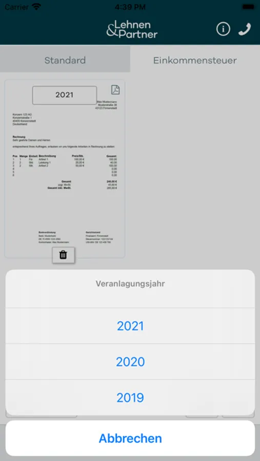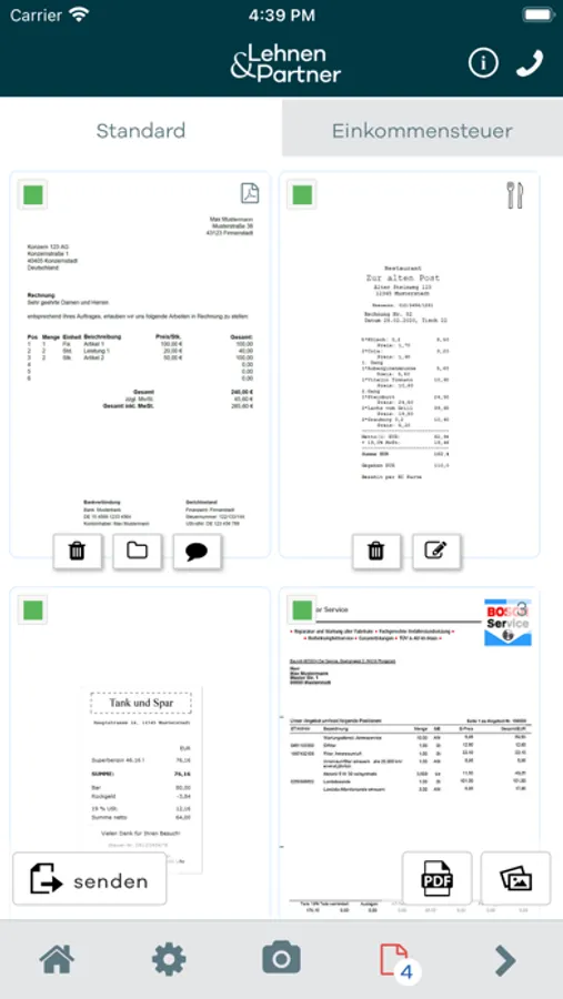 Machen Sie einfach ein oder mehrere Fotos von den Belegen und versenden Sie diese mit einem Klick direkt aus der App heraus an die Kanzlei Lehnen und Partner.