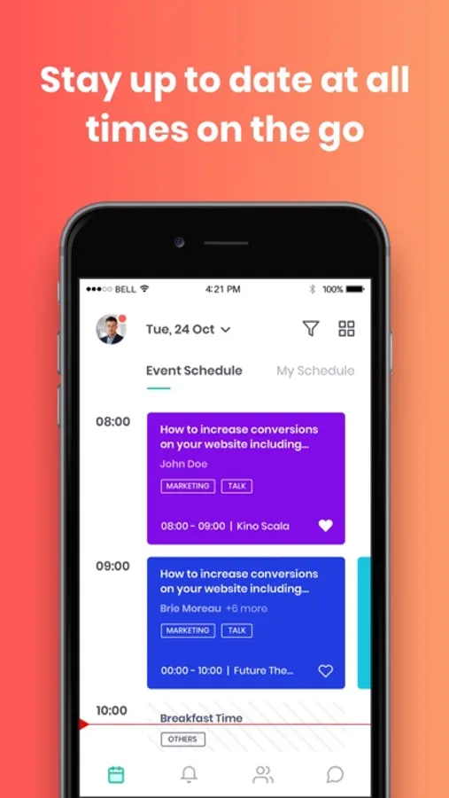 Goodevent allows you to access conferences around the world and interact with organizers, speakers as well as other attendees. You can simply sign up to create an account and set up your profile so the people at the conference know who you are and can reach out. Afterward, you can easily join an event by entering the #hastag created by the organizers. Inside the event, you will be able to access schedule, talk details, speaker profiles and practical information about the conference you are attending or are about to attend.