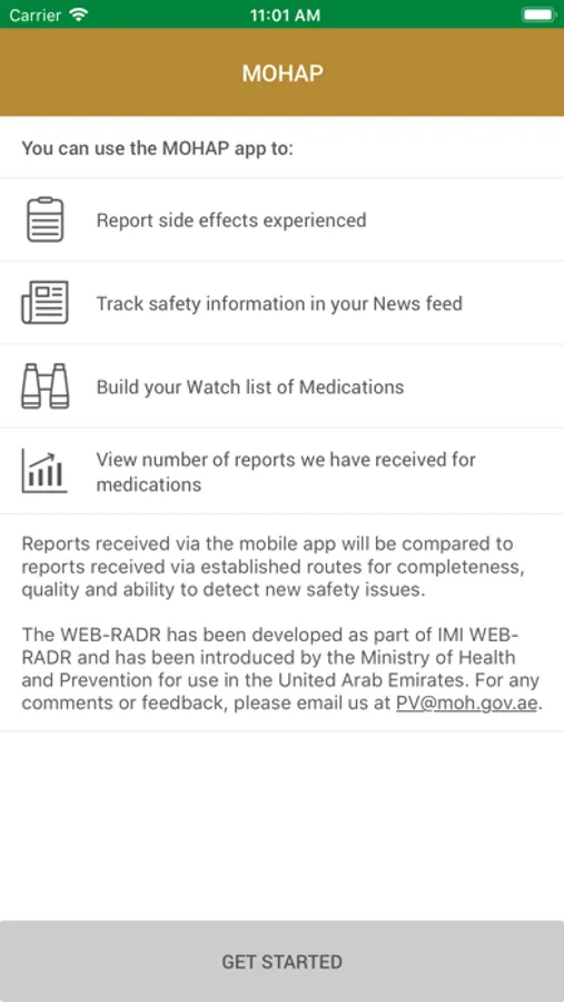 The UAE RADR app enables you to report side effects and review information published by the MOHAP related to medicines that are of interest to you.