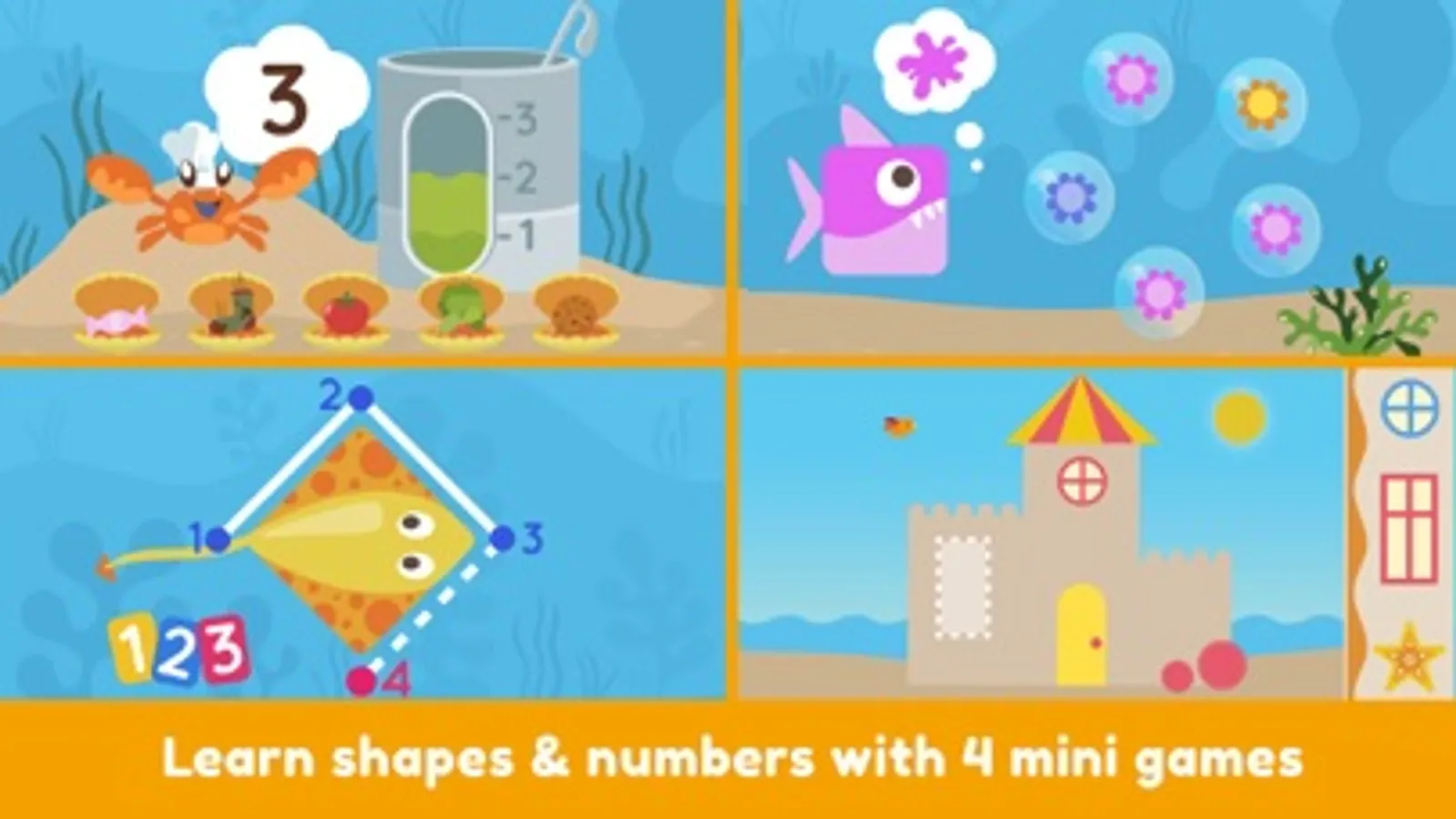 • 4 original mini games for toddlers to learn shapes, colors & numbers through play