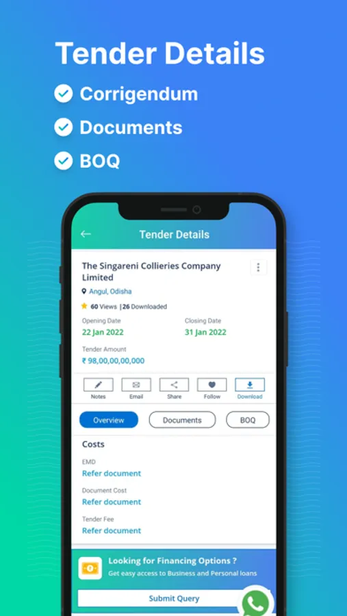 You can search easily from a large database of Live Tenders, Archived Tenders and Tender Results. You can view complete Tender Details, Corrigendum and Documents including NIT and BOQ. You can also view tender results having Bidder Details, Amount and AOC documents to improve your bidding strategy.