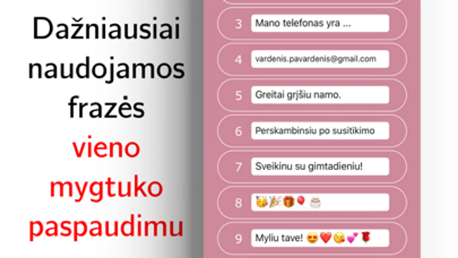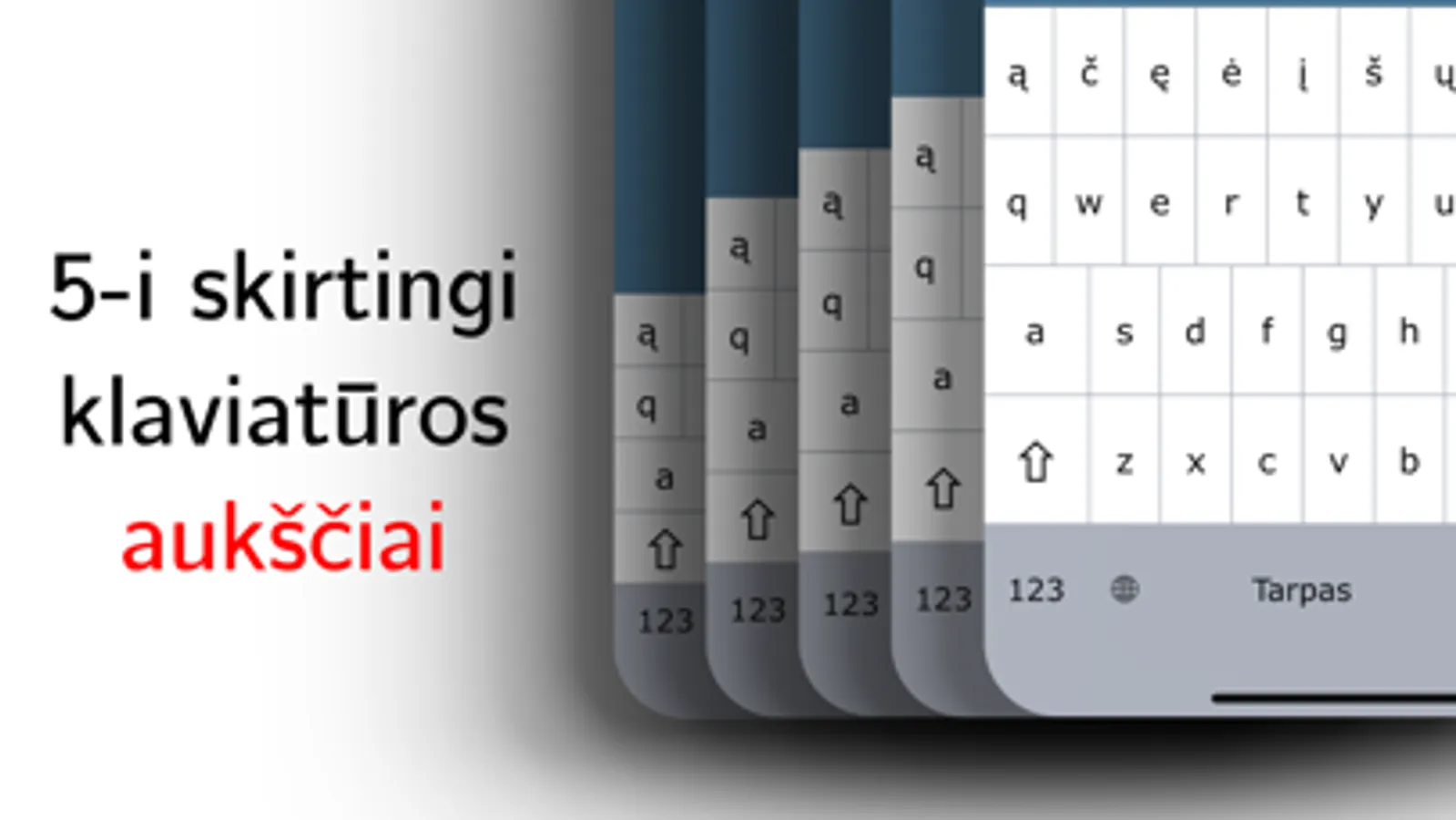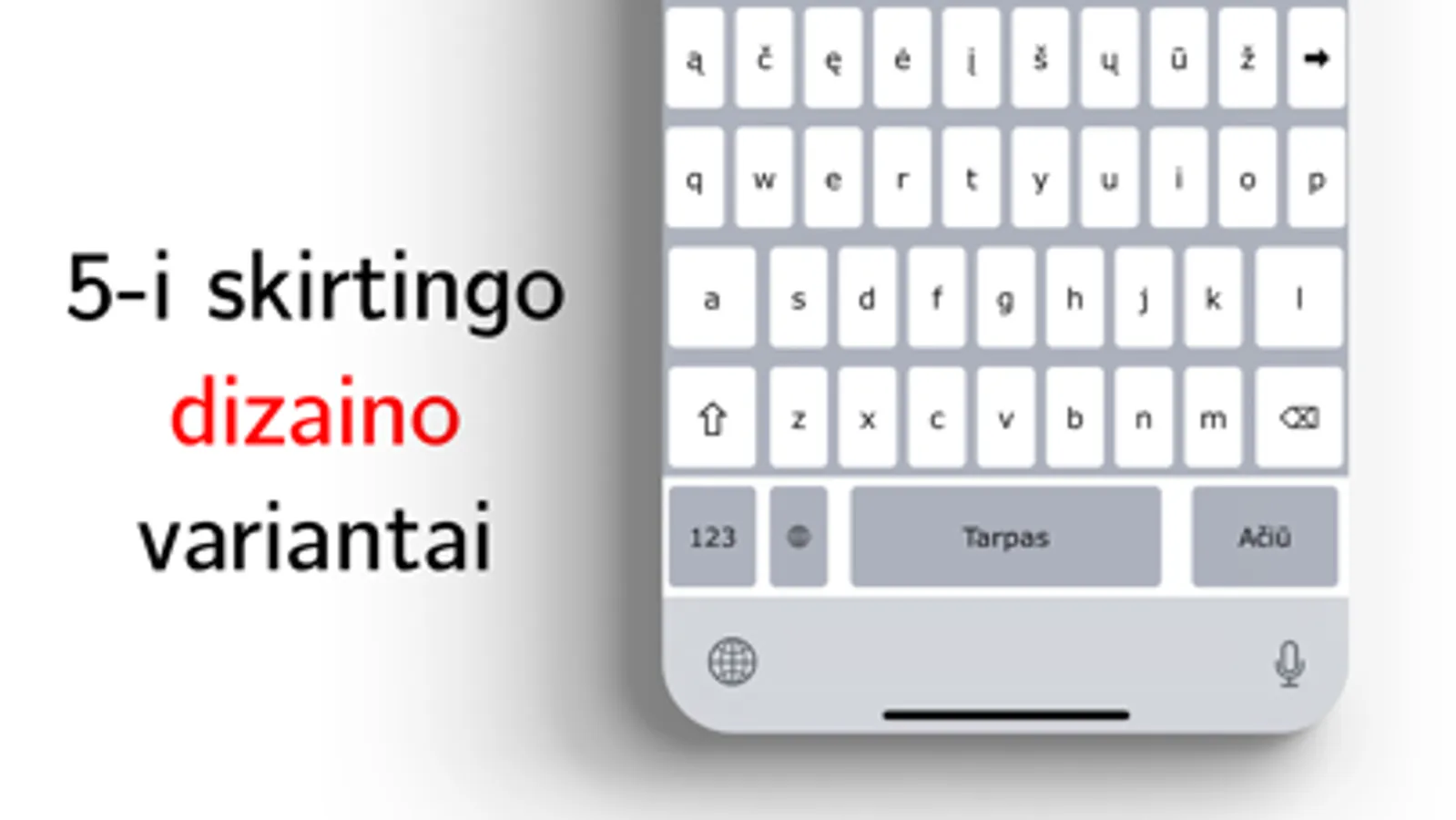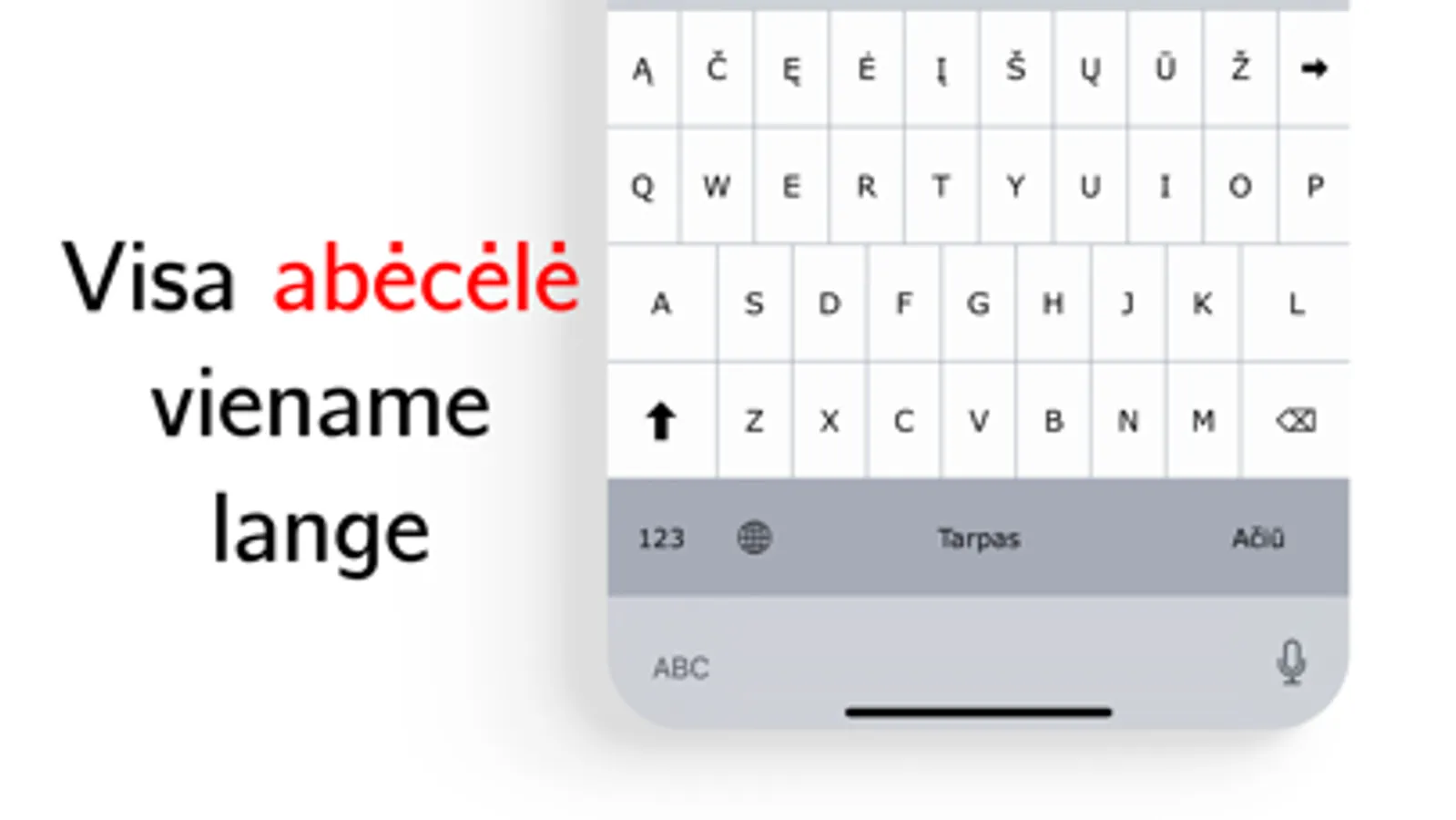 Visos lietuvių kalbos abėcėlės raidės vienoje bendroje klaviatūroje. Taupykite laiką, rašykite greičiau, gaukite apdovanojimus naudodami taisyklingą lietuvių kalbą, susikurkite savo dizainą, įrašykite dažniausiai naudojamas frazes ir naudokite jas vieno klavišo paspaudimu.