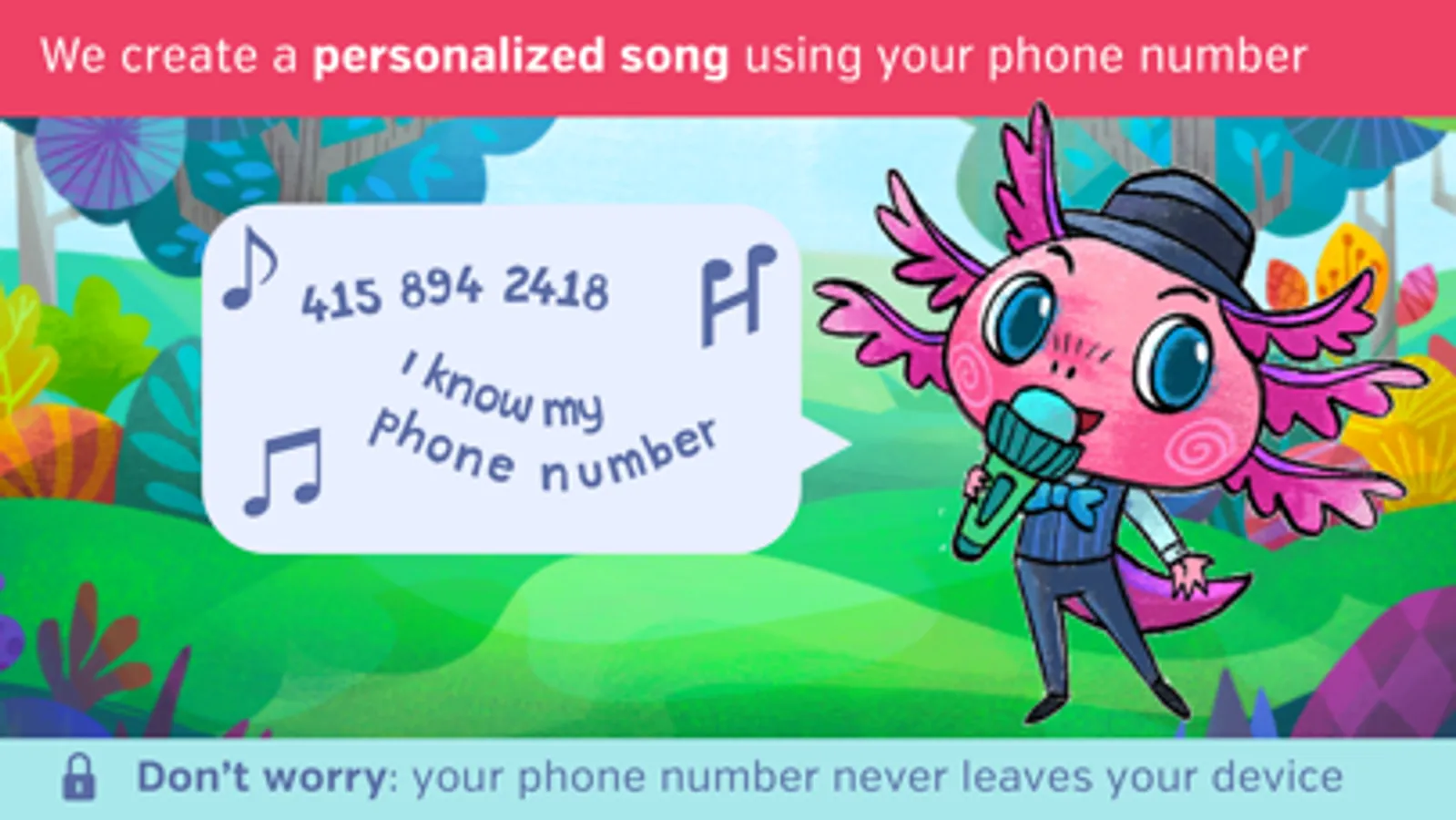 All you have to do is type in your phone number and we’ll create a personalized song from children’s recording artist and educator, Bobby Beetcut. You and your child can sing along and remix the custom song with hundred of musical combinations. In no time your child will be proudly singing your number. And don’t worry, for added security, your phone number never leaves your device.