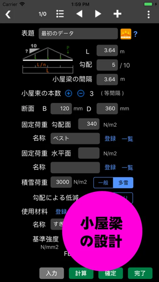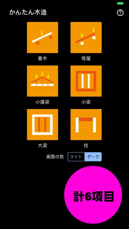 部材の種別に応じ、垂木・母屋・小屋梁・小梁・大梁・柱という、独立した6つの項目で構成されています。