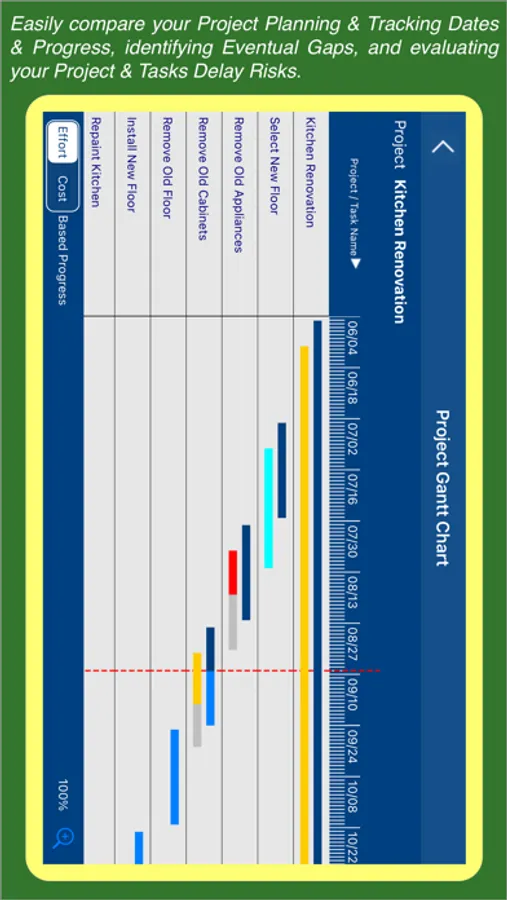 d.2) The "Project Gantt Chart" screen highlights project & task planning & tracking dates, progress, and delay risks.