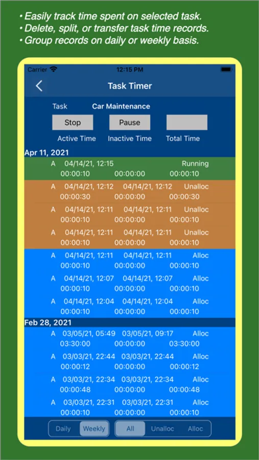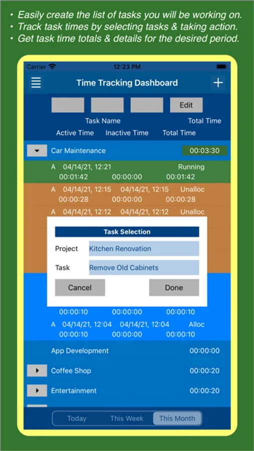 d) The Task Timer screen allows you to automatically track the time spent on one particular project task