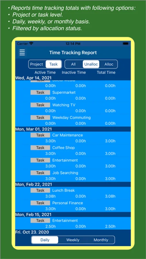 c) The Time Tracking Report screen provides the total daily, weekly, and monthly time spent on your projects & tasks