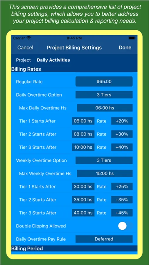 a) The Project Billing Settings screen allows you to configure several project billing parameters such as regular time rate and daily & weekly overtime rates & limits.