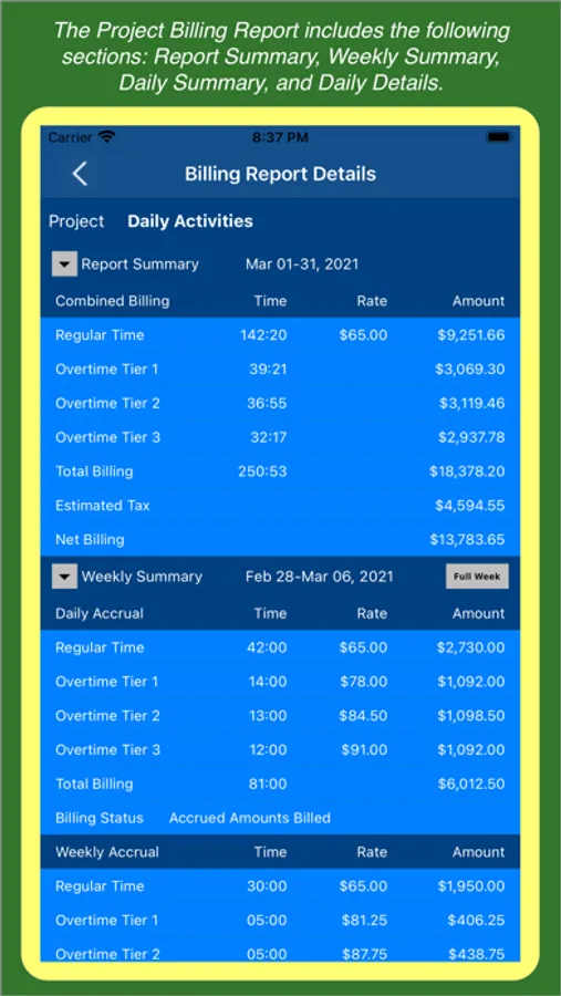 c.1) The Billing Report Details screen provides a multi-level billing report encompassing the following sections: Report Summary, Weekly Summary, Daily Summary, and Daily Details.
