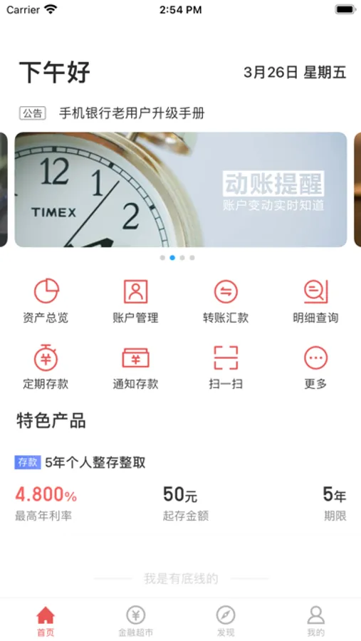 手机银行为您提供账户查询、账户管理、行内转账、跨行转账、本人账户互转、活期转定期、定期转活期、通知存款开立、通知存款支取等丰富的移动金融服务。