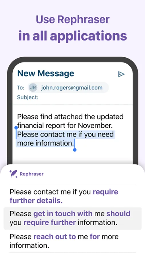 Access Rephraser in one-click directly from Gmail, Twitter or iMessage via the integrated Share extension and iMessage app.
