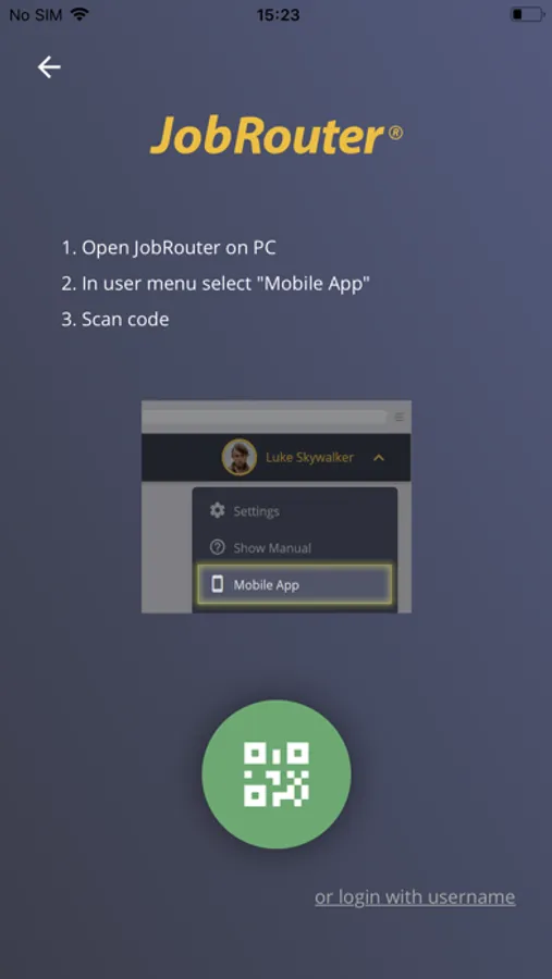 Authentification can be done easily by scanning a QR code in JobRouter or entering a valid JobRouter URL, username and password.