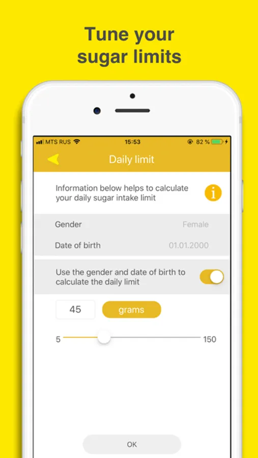 "Smart sugar" is an app that helps you to avoid going over the recommended daily sugar consumption. It calculates how much sugar you eat per day and compares it with the average.