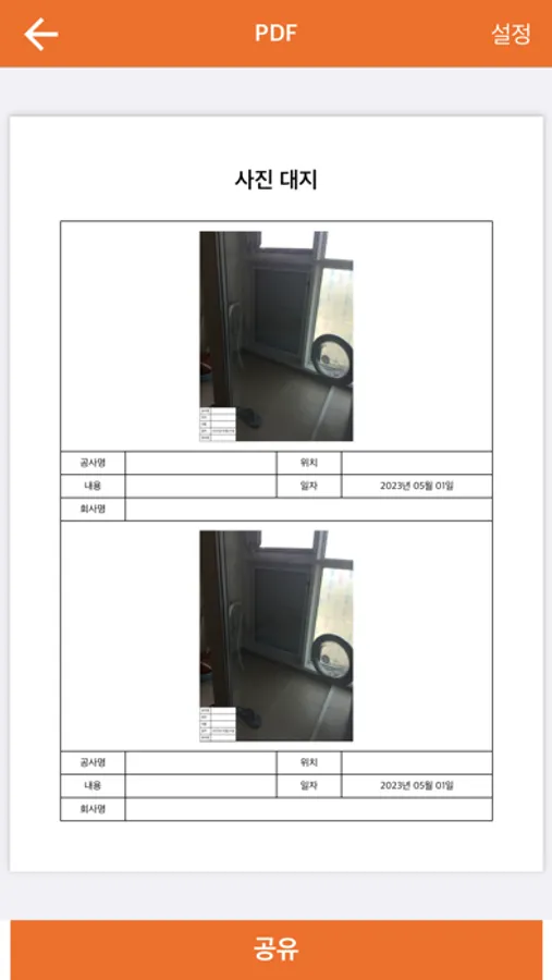 - 공사 보드판 앱에서 생성하고 저장한 사진과 데이터로 A4 용지의 사진대지 문서를 구성해줍니다.