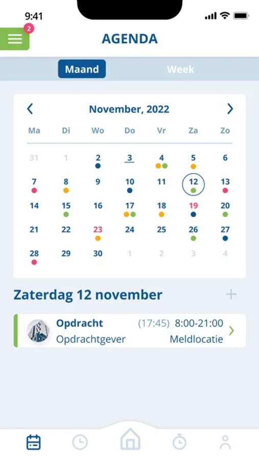 Na het inloggen heeft u toegang tot uw agenda, uren en eventuele wijzigingen in uw planning.