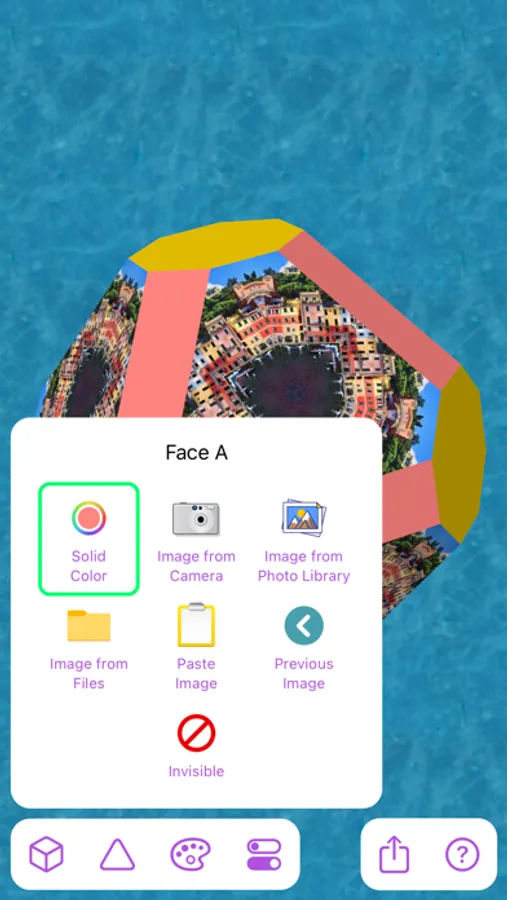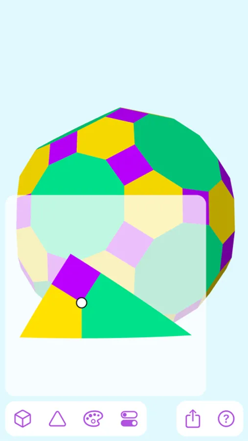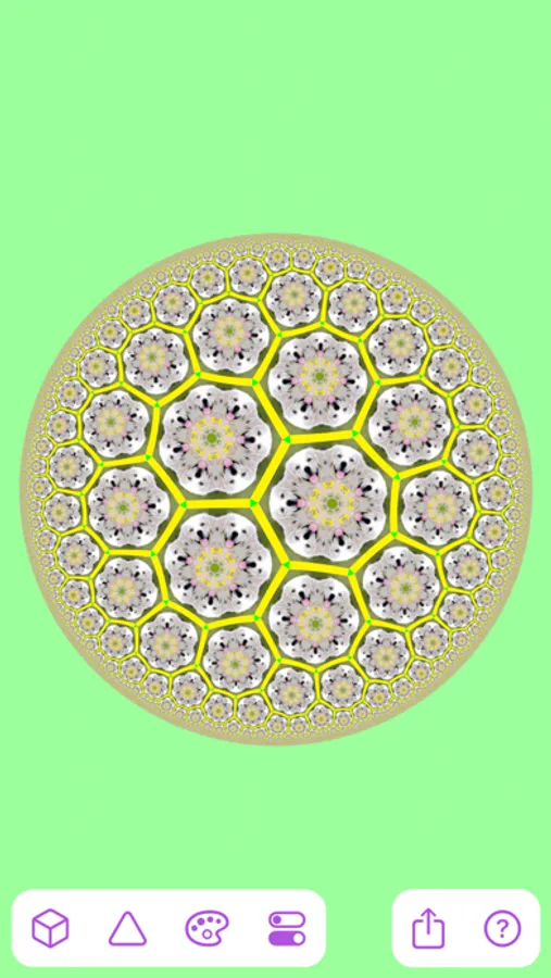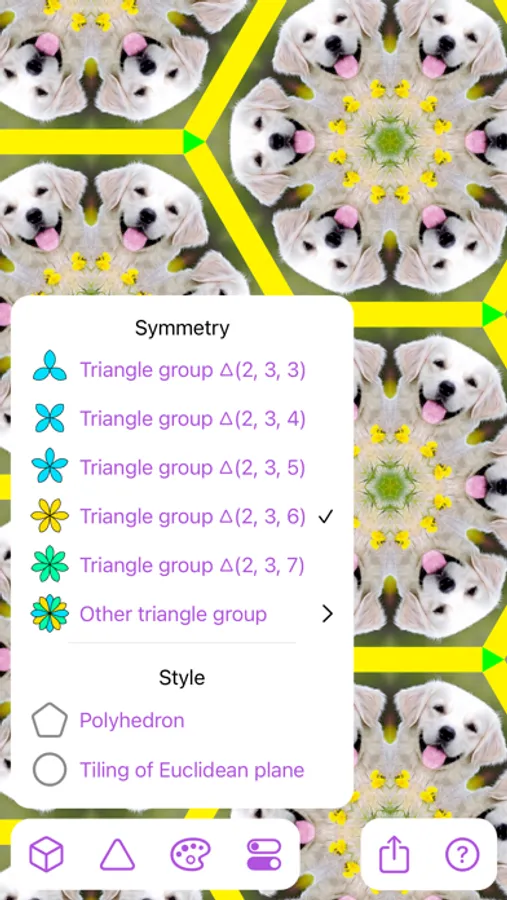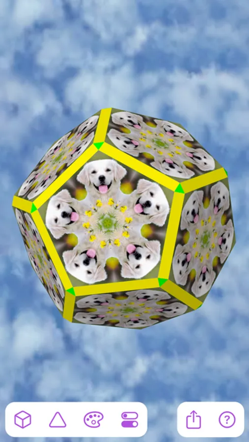 Explore polyhedra and tilings while creating colorful kinematic art. Polyhedron mode lets you create traditional polyhedra, while Tiling mode smooths your polyhedra into tilings of the sphere, Euclidean plane or hyperbolic plane. Decorate your work with images from your photo library, fresh images from the camera, or colors. Within each symmetry group, any polyhedron or tiling morphs to any other; for example, you may morph a dodecahedron to an icosahedron, confirming that they share the same symmetries.