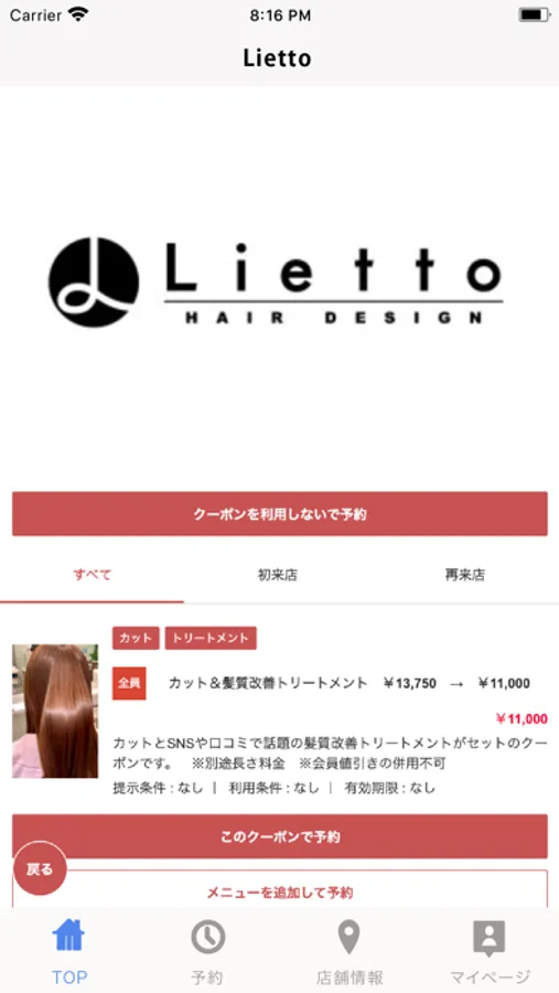 お得なクーポンが配信されます。ネット予約時にクーポン利用での予約も可能なので来店時もスムーズに施術頂けます。