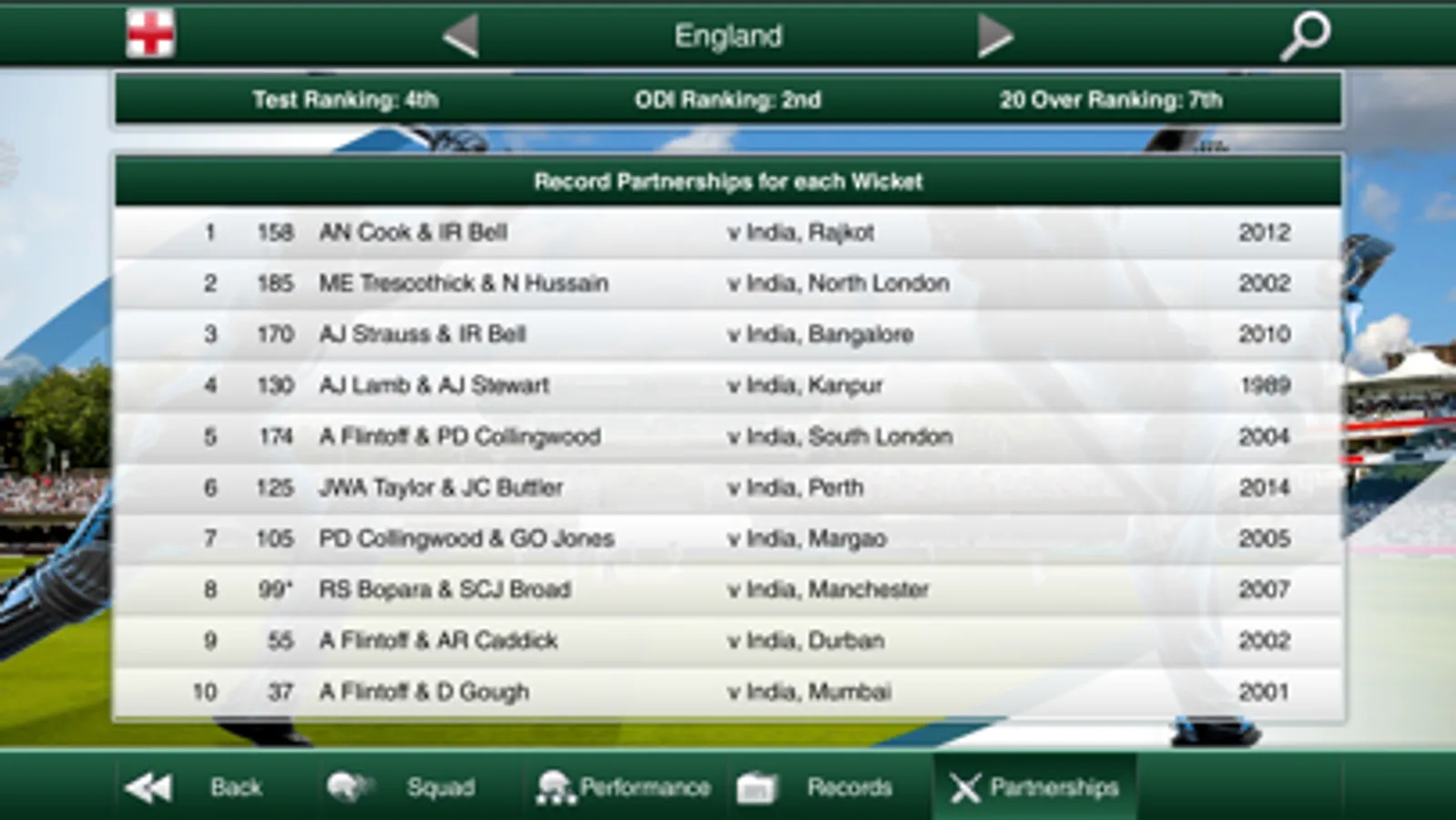 • Historical scenarios: replay five historical scenarios for India or Pakistan in England.