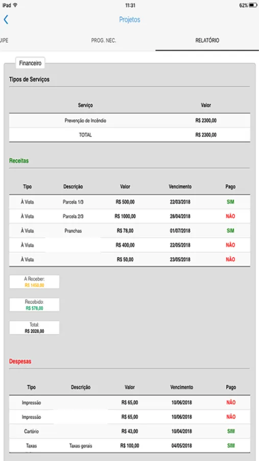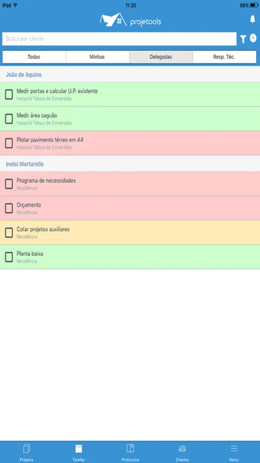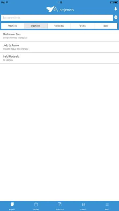 - Cadastre diversos tipos de projeto (Arquitetônico, Prevenção, Ambiental, Interiores... etc) com suas etapas (Ex: Estudo, 2D, 3D, Aprovação)