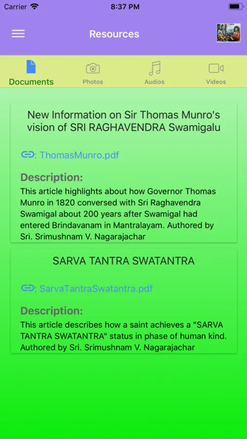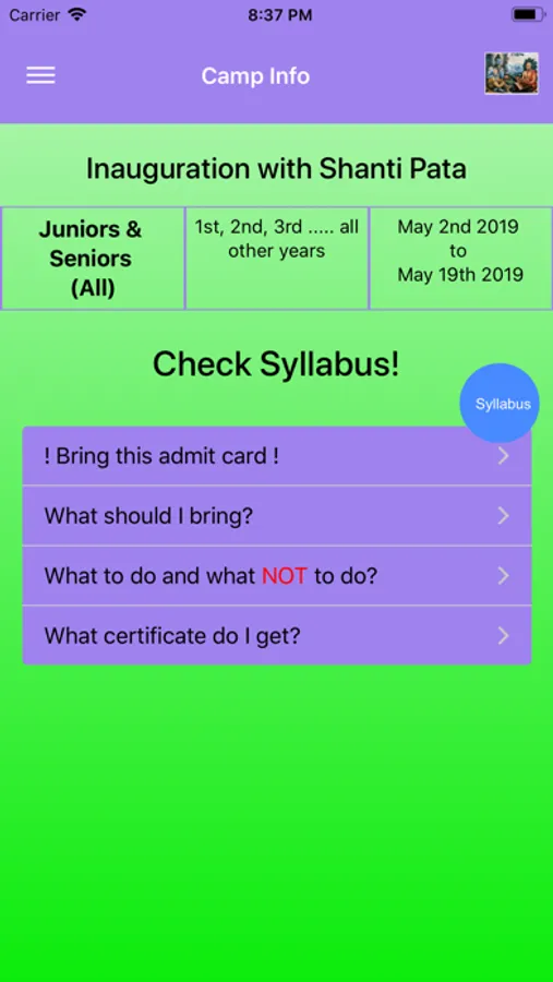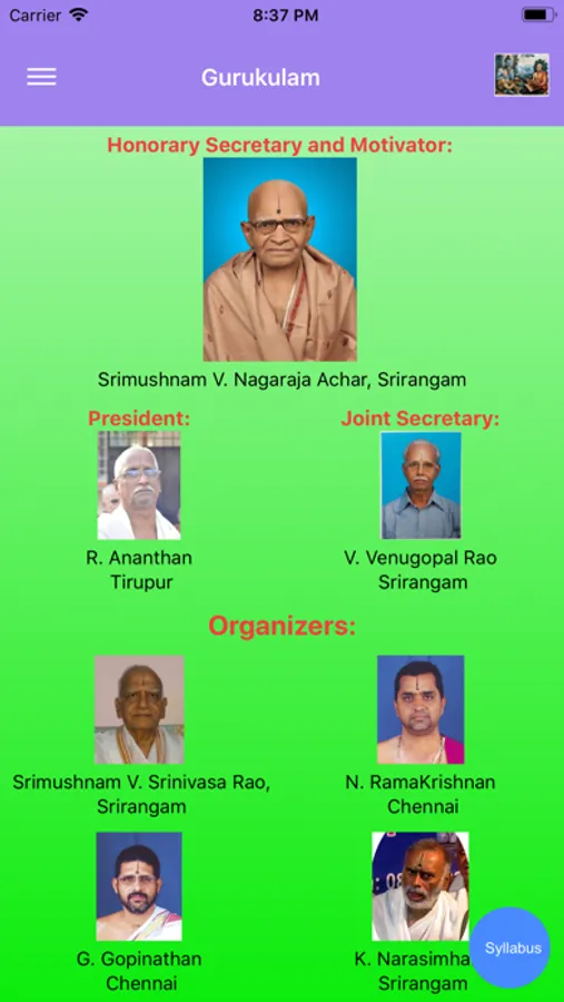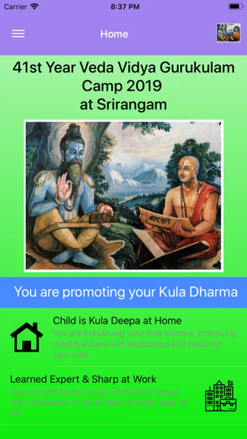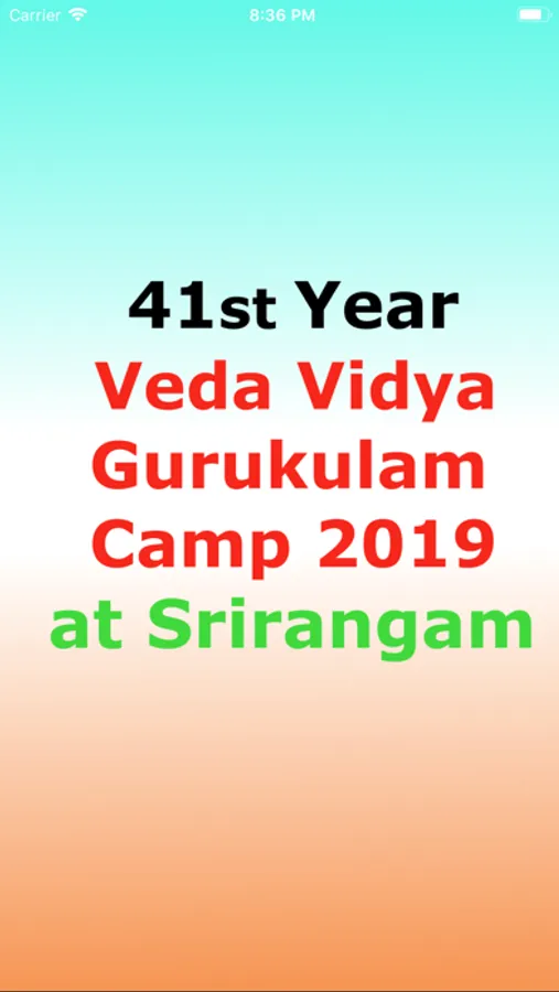 This app helps with Veda Vidya Gurukulam camp activities at Srirangam. This app is for vidyarthis, acharyas, adhyapakas and vidyarthi's parents and rest of the world to know about Veda Vidya Gurukulam camp activities at Srirangam. This app has information about the camp organizers, camp details, class schedules, syllabus for each year, daily class activities with timings, vidyarthi, adhyapakas and acharya details. This app also contains learning resources useful for everyone to share and learn. Learning from this app is not limited to the camp members only. Everybody in the world can potentially benefit from the camp through this app.