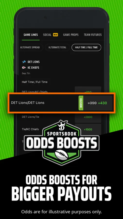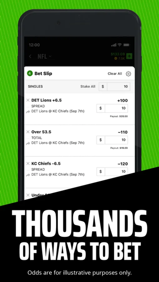 Early Win/No Sweat: Must opt in to both offers separately. 1 No Sweat and 1 Early Win token issued per eligible gameday, up to 3 tokens each per week, per customer. NFL bets only. Tokens must be applied BEFORE placing bets. No Sweat: Bet must lose. Paid as 1 Bonus Bet based on amount of losing bet. Early Win: Min. $1 pregame moneyline bet req. If chosen team goes up by specified amount of points at any time, your bet wins. Early Win team lead may vary each gameday. Tokens cannot be combined and expire at start of the last game each gameday. Max. bet limits apply. Early Win ends 10/02/23 and No Sweat ends 11/7/23. See terms at dkng.co/ftball.