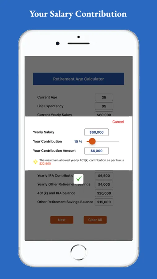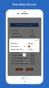 *This app considers that you can contribute only up to a specific maximum limit to your employer-sponsored retirement plan. For example, you can contribute a maximum of 22,500 dollars to your 401(k) or 403(b), or 457(b) plan for this year as per the current law. However, there is a catch-up contribution limit of additional 7,500 dollars if you are aged 50 and older.