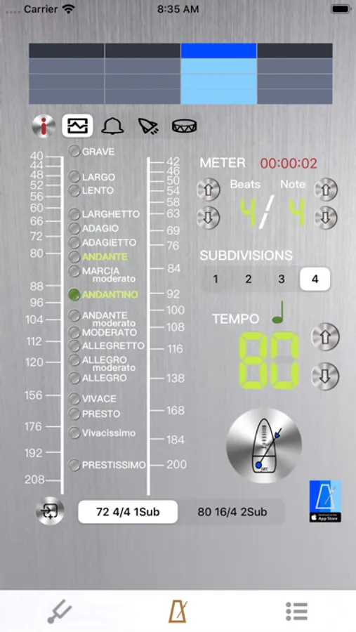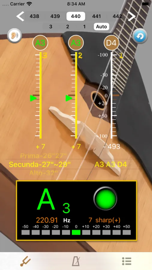 ▪ The scale for precision tuning is 10 cents for every sub-bit. The brown line represents the open strings start from. The green arrow means pitch is accurate and it will turn white once the pitch difference exceeds more than a sub-bit.