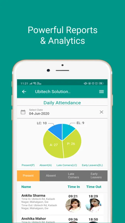 8. Insightful Reports & Graphs: Track latecomers, early leavers, absentees, employee’s overtime & under time, Client Visits with powerful reports.