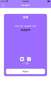 3. Học từ vựng với FlashCard : Các từ vựng trong bài học sẽ được random hiển thị , khi bạn bấm vào chính giữa thẻ bài sẽ hiển thị nghĩa của từ vựng và phát âm thanh. Khi bạn click vào bên trái thẻ bài sẽ quay lại từ trước , click vào bên phải của thẻ bài thì sẽ chuyển sang từ mới.