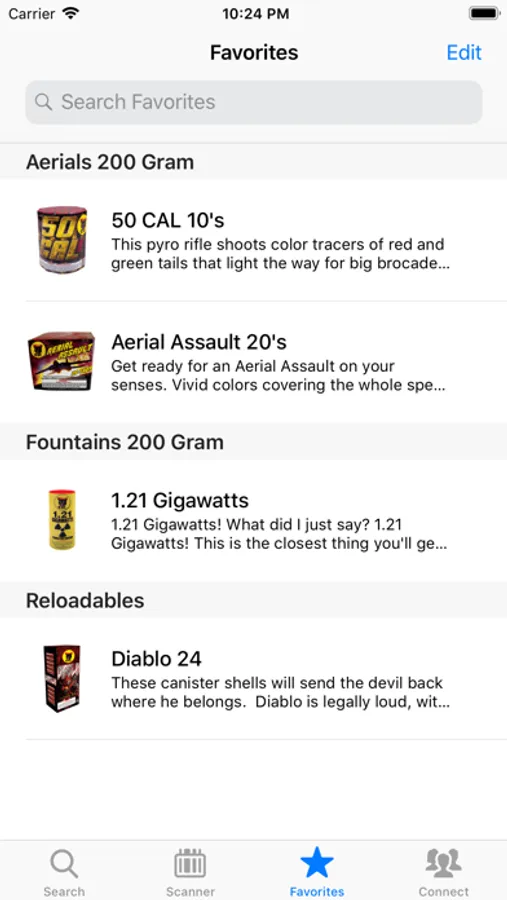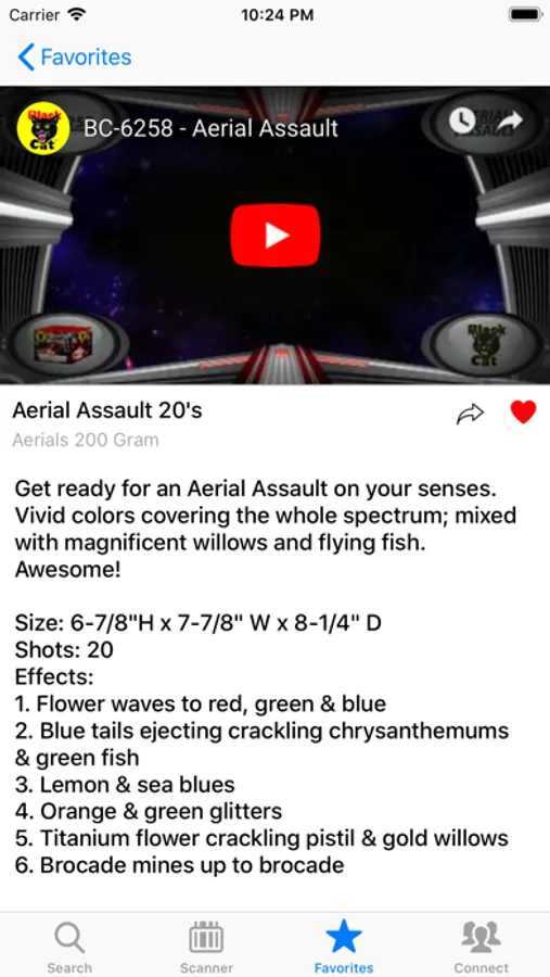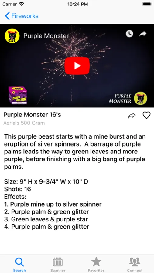 Black Cat Fireworks allows the consumer to view our entire product catalog. Read about the effects or watch the video to get a perspective of what the item does. You can add items to your favorites list before you shop. While in the store, bring up the barcode scanner and scan any Black Cat item to view the description or watch the product video. An engaging experience that puts the control in your hands.