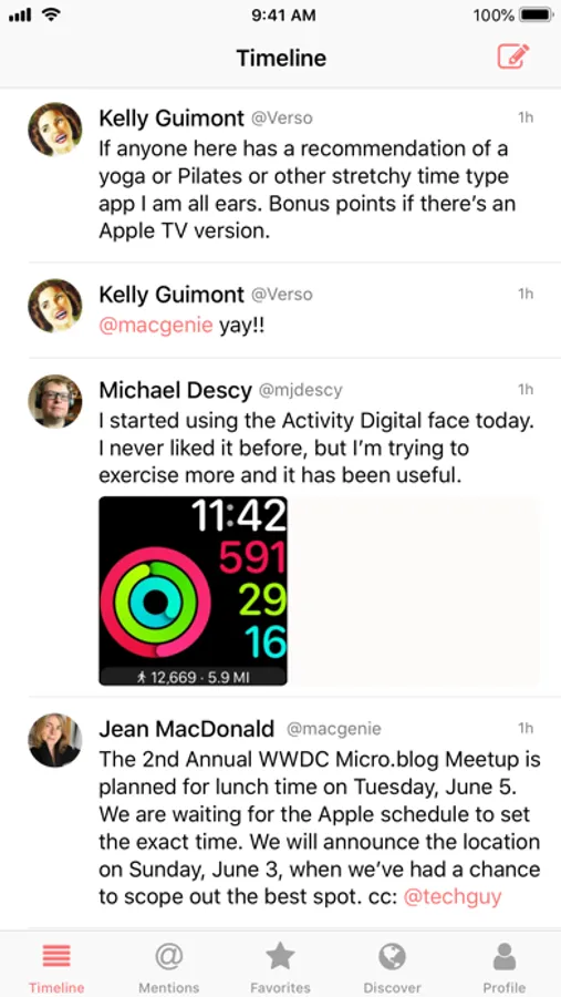 View your timeline, mentions, favorites and the discover section. Post to micro.blog hosted sites or own Wordpress sites. Reply to users and view ongoing conversations.