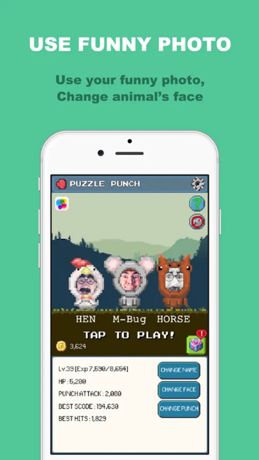 Choose your funny photo from your album to change animal's face! Reach a higher level, punch to animals more heavier and win easily.