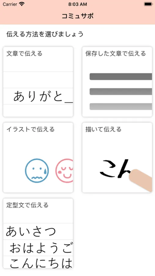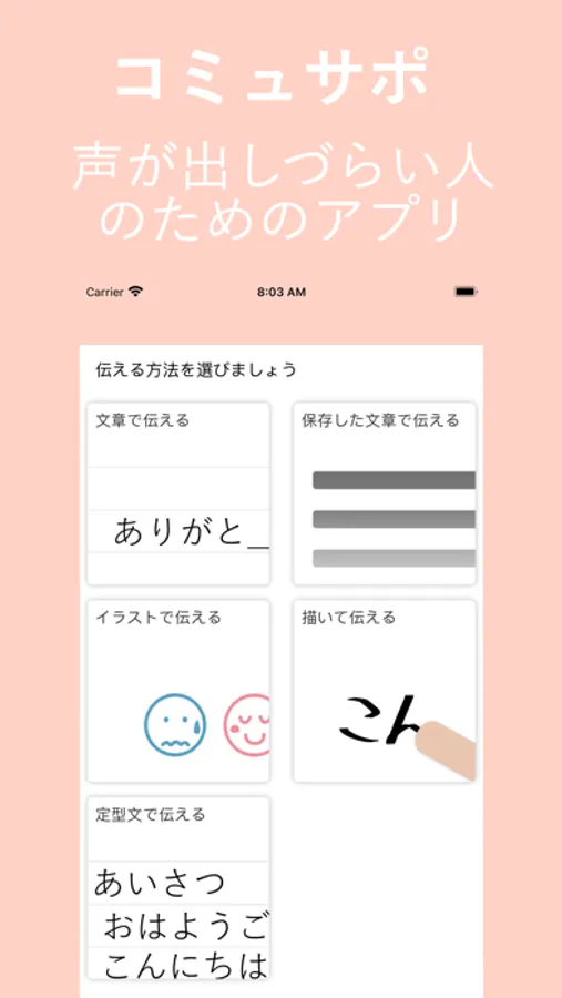 場面緘黙症、吃音症、失声症などの症状で口頭のコミュニケーションがうまくできない方をサポートするアプリです。