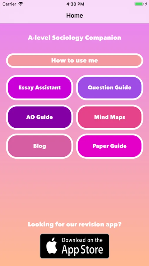 This app is designed for students taking AQA A-level sociology. The 'essay assistant' will get you writing like a sociologist, whilst the 'question guide' will remind you of what's needed for each type of exam question. That's not all, the app also has a breakdown of each exam paper, detailed mindmaps and more!
