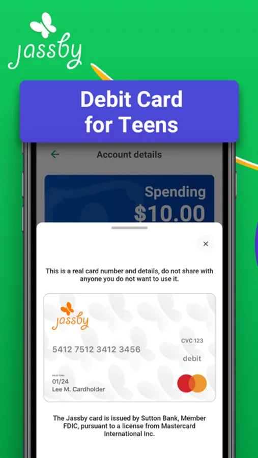 The Jassby Debit Card is designed to help your child learn financial literacy, add funds directly to their card and save money with no fees. You control the card from your phone and are notified of all transactions. Debit Cards can be used with parental supervision online or through contactless payment at any store that accepts Apple Pay.