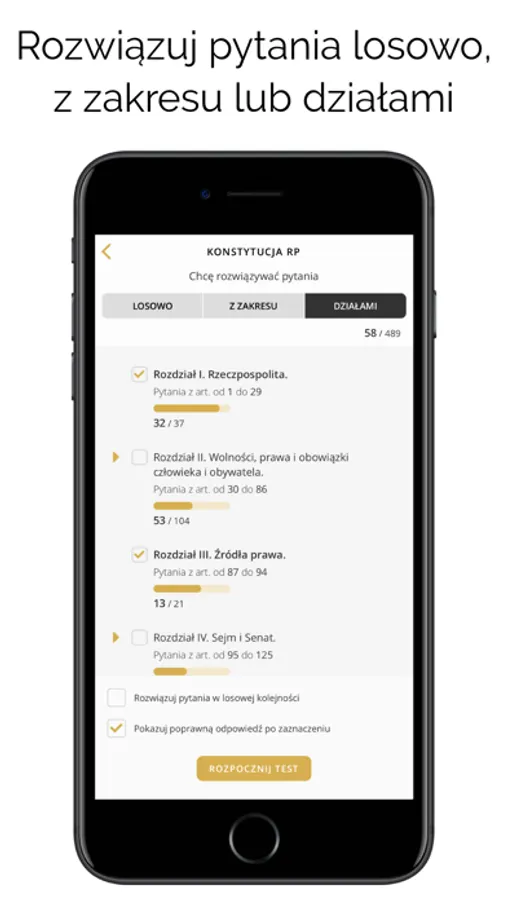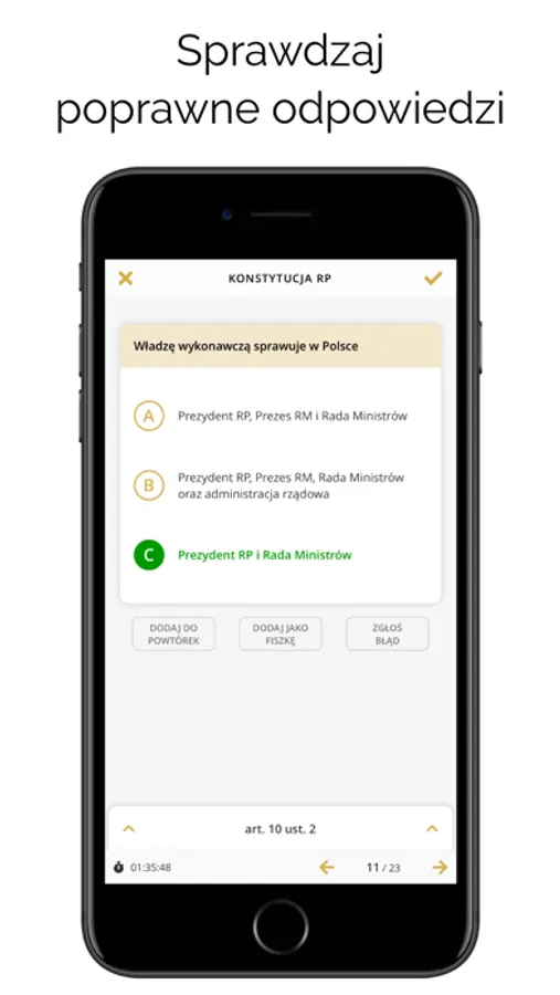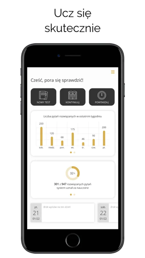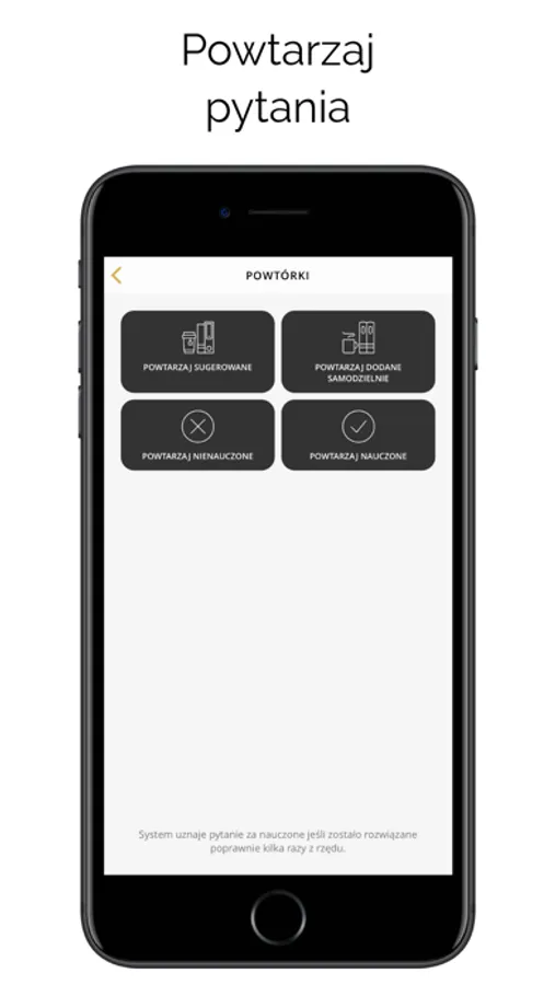 - Śledzenie postępów w nauce - rozbudowany moduł statystyk pokazujący m.in ukończone testy, liczbę pytań jakie pozostały jeszcze do rozwiązania i średnią skuteczność