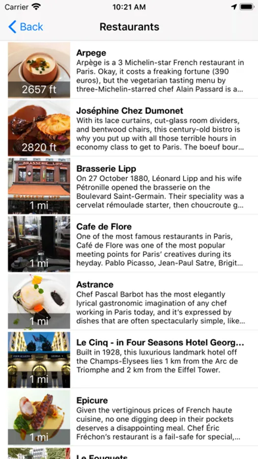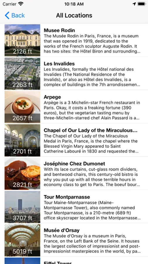 The user interface shows the user's location relative to the other attractions in the city, sorted from nearest to furthest. That way one can see exactly what is near by from the home screen.
