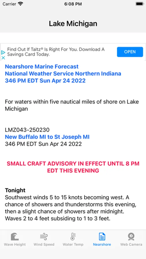 Data is pulled from the NOAA (National Oceanic and Atmospheric Administration) Marine Forecast database. View predicted Wave Height, Wind Speed, Water Surface Temperature, and Nearshore Forecasts. View webcam images along the lake. For webcam and App suggestions, please contact me though the support link.