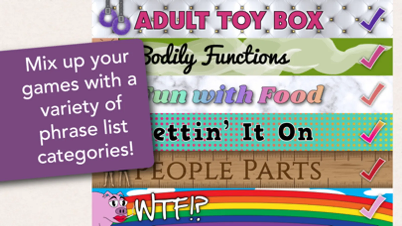 There are also some options to customize your Skadoodle! Dark & Dirty experience: toggle phrase categories on & off, choose the number of players (2, 4, 6, 8, or 10), and decide whether or not to use a drawing timer. And remember, you can always expand your phrase selection with a one time purchase that unlocks all current and future lists.