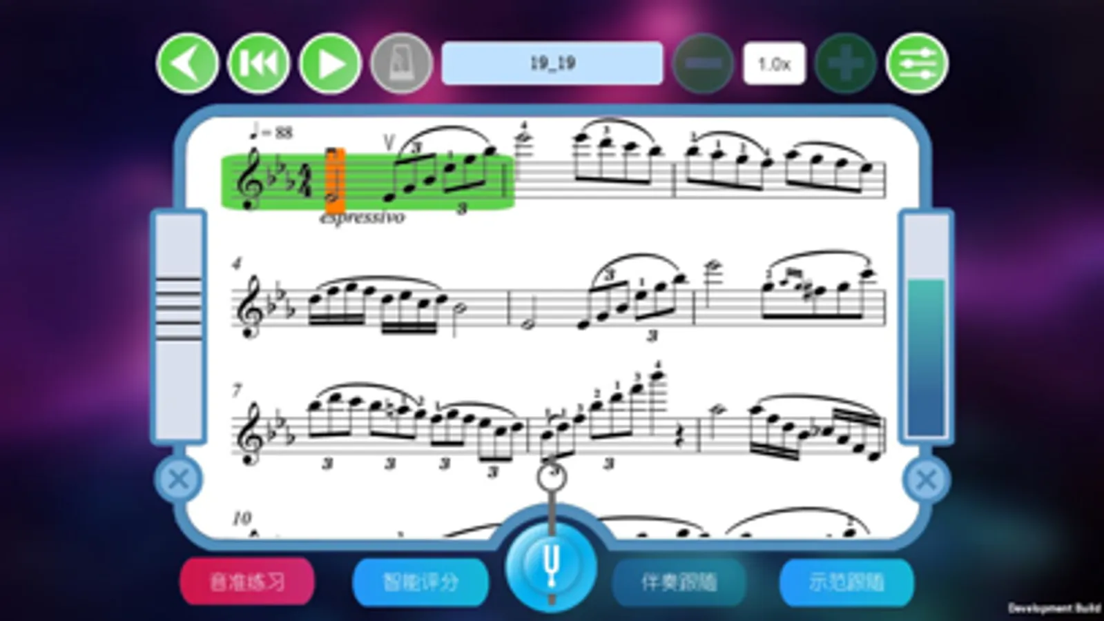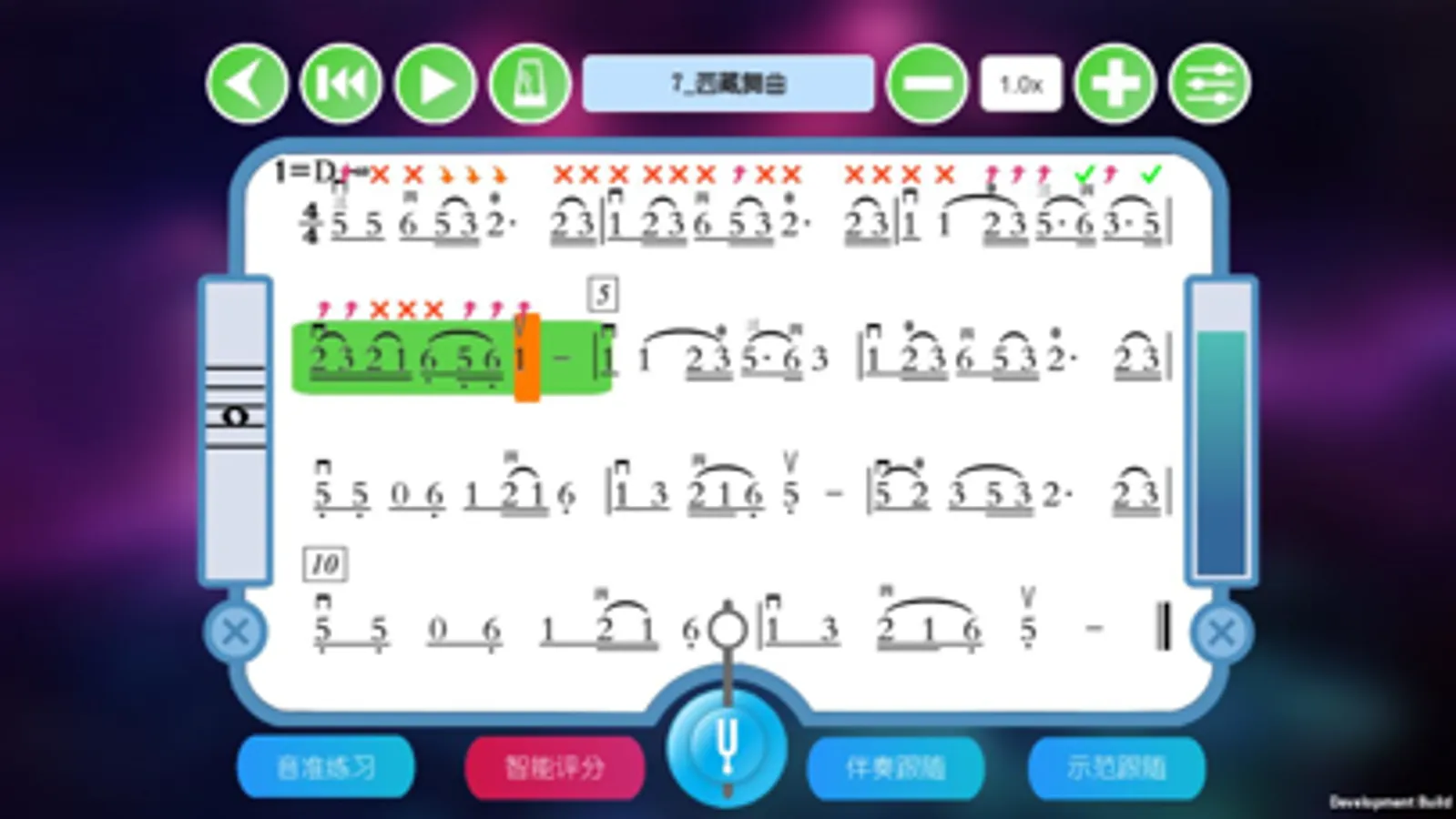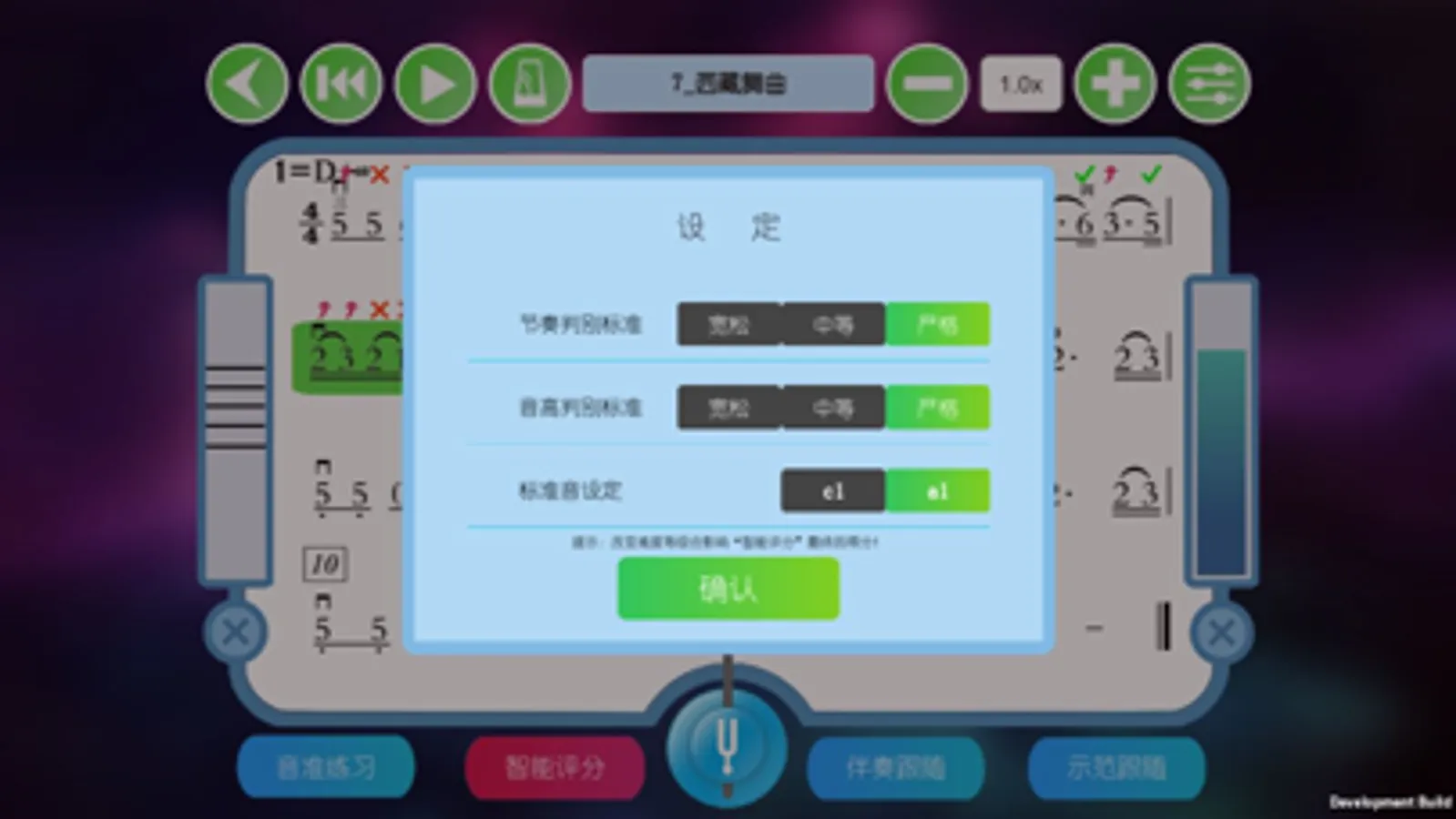 1、音准练习模式:只有当音高演奏正确的时候光标才能移动,在视奏时辅助练习;