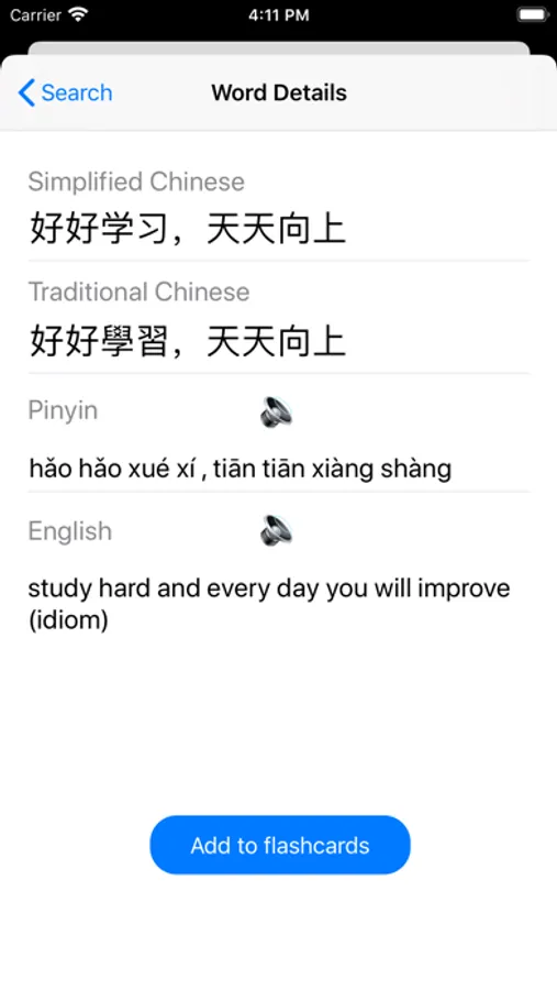 -Mandarin and English pronunciation available (tap the speaker icon). Cantonese can be enabled in Settings.